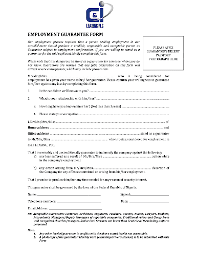 Our employment process requires that a person seeking employment in our establishment should produce a credible, responsible and acceptable person as guarantor.